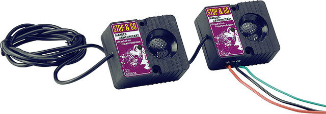 Високоефективно ултразвуково устройство с връзка за захранване за превозно средство. Честотно модулирани ултразвукови тонове сигнализират за "изключителна опасност" на белката чрез животински страх и предупредителни викове. Няма ефект на привикване. Два високоговорителя предотвратяват звукови сенки. Особено подходящ за тесни и компактни двигателни отделения.
