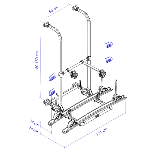 Устойчивост: 60 кг. Дълбочина: 74 см. Височина: 80 – 150 см. Широчина: 131 см.