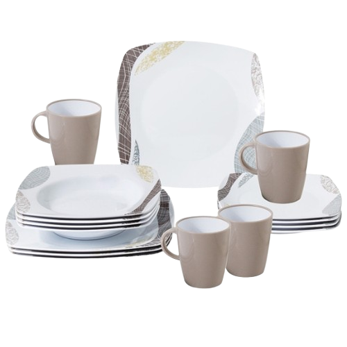 Комплект от 16 части, състоящ се от: Четири чинии за хранене (Ø 26 см) Четири десертни чинии (Ø 20 см) Четири чинии за супа (Ø 22 см) Четири чаши (300 ml)