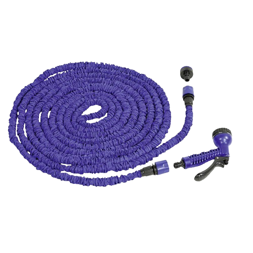 Разтегателен гъвкав маркуч с накрайник и пистолет за поливане. Цвят: син, Размери: 750 х 2 х 1,5 см. Дължина: 750 см.