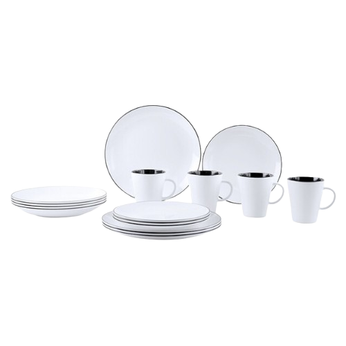 Комплект от 16 части, състоящ се от: Четири чинии за хранене (Ø 25,5 см) Четири десертни чинии (Ø 21 см) Четири чинии за супа (Ø 23 см) Четири чаши (300 ml)