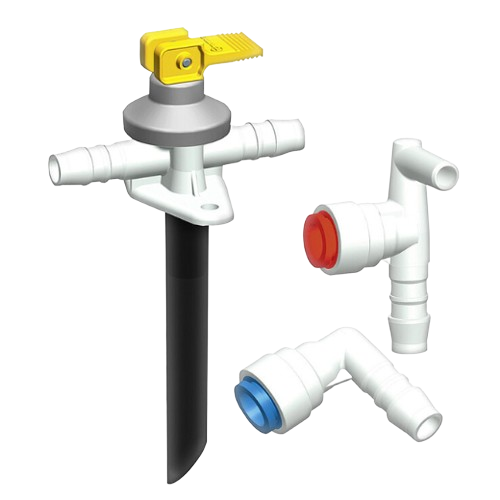 Тruma комплект за свързване на вода ABO. Комплектът се състои от безтоков изпускателен кран, колянови фитинги за маркучи за вода Ø 10 мм и мек и черен PVC маркуч Тегло: 0.08 кг.