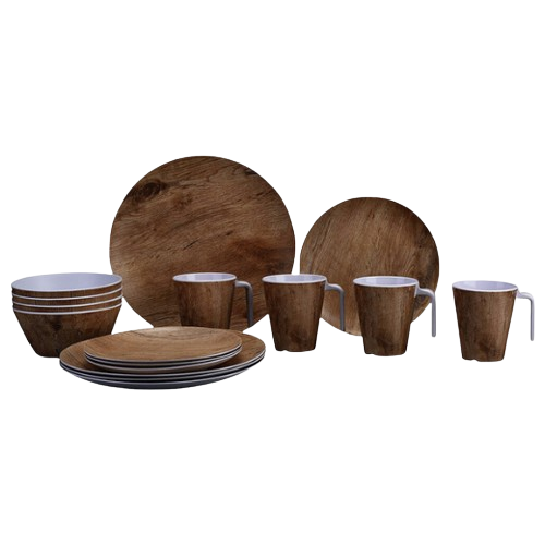 Комплект от 16 части, състоящ се от: 4 големи чинии 4 малки чинии 4 купички със зърнени храни 4 чаши за кафе (с възможност за подреждане) Цвят: Кафяв