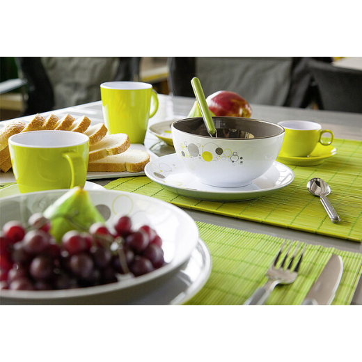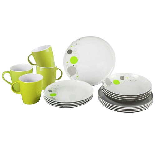 Комплект от 16 части, състоящ се от: 4 чинии за хранене (Ø 25 см) 4 чинии за супа (Ø 21 см) 4 десертни чинии (Ø 20 см) 4 чаши (300 ml) Цвят: Бяло / Сиво / Лайм